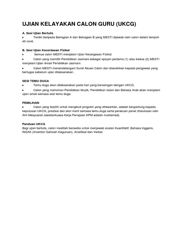 Namun Ujian Inventori Sahsiah Keguruan INSAK tetap dilaksanakan. Ujian Kelayakan Calon Guru eUKCG e-UKCG terdiri daripada Bahagian A 120 soalan dan Bahagian B 60 soalan. Ujian Kelayakan Calon Guru UKCG Baru-baru ni aku dapat panggilan interview untuk jawatan guru vokasional secara interim.
